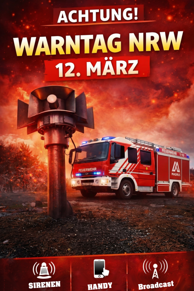 Am Donnerstag, den 12. März 2026 findet der landesweite Warntag statt. Nordrhein-Westfalen testet wieder seine Warnmittel. Ziel dieses Probealarms ist es, die Bevölkerung weiter zu sensibilisieren, die Warnprozesse zu optimieren und das Zusammenspiel sowie die Funktionalität der unterschiedlichen Warnmittel zu testen. Dazu heulen an diesem Tag um 11.00 Uhr die Sirenen. Zusätzlich werden Warnmeldungen über […]