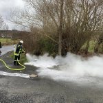 Wir wurden auf die K15 zwischen Holzhausen und Flammersbach alarmiert, es brannte eine Dixitoilette.